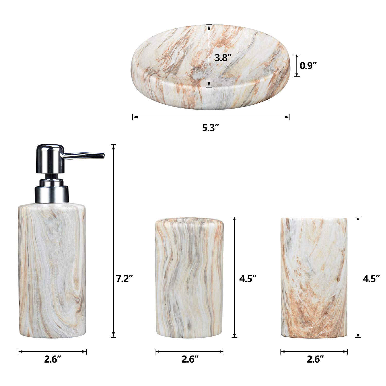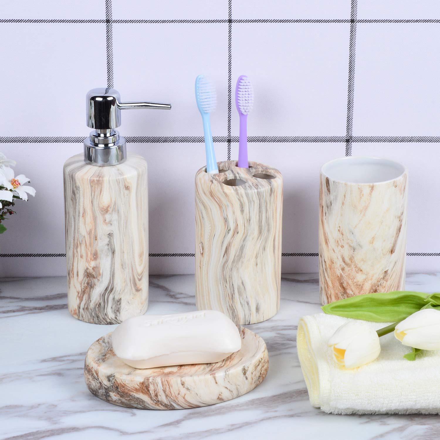 - Material : Ceramic, Pack of 4 items : Toothbrush holder, soap dish, liquid dispenser, tumbler holder; COMPLETE BATH SET: Comes with a Hand Soap Dispenser, Toothbrush Holder, Soap Dish and Tumbler