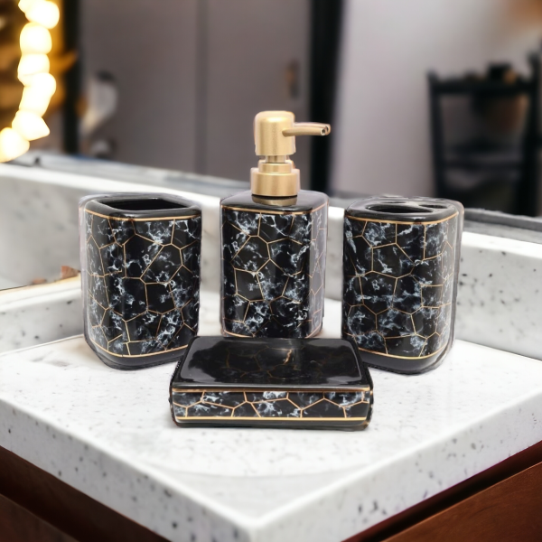 - Material : Ceramic, Pack of 4 items : Toothbrush holder, soap dish, liquid dispenser, tumbler holder; COMPLETE BATH SET: Comes with a Hand Soap Dispenser, Toothbrush Holder, Soap Dish and Tumbler