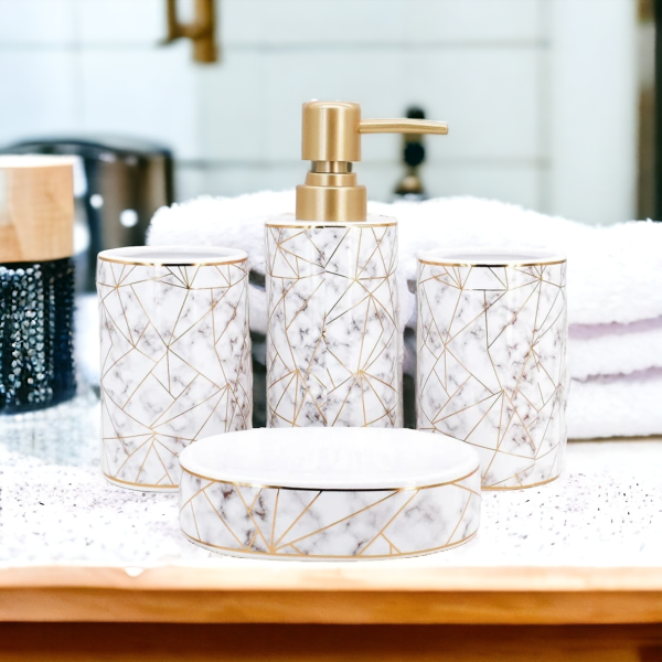 - Material : Ceramic, Pack of 4 items : Toothbrush holder, soap dish, liquid dispenser, tumbler holder; COMPLETE BATH SET: Comes with a Hand Soap Dispenser, Toothbrush Holder, Soap Dish and Tumbler