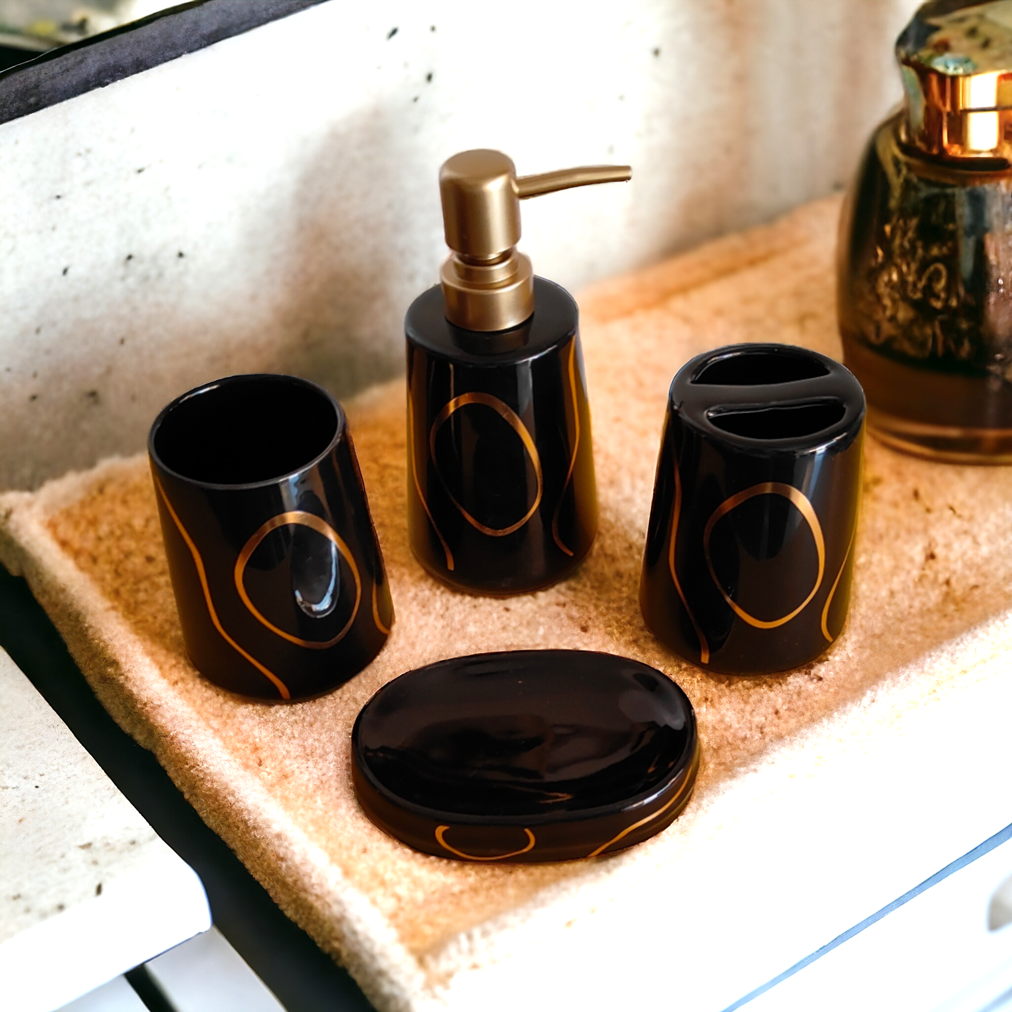 - Material : Ceramic, Pack of 4 items : Toothbrush holder, soap dish, liquid dispenser, tumbler holder; COMPLETE BATH SET: Comes with a Hand Soap Dispenser, Toothbrush Holder, Soap Dish and Tumbler