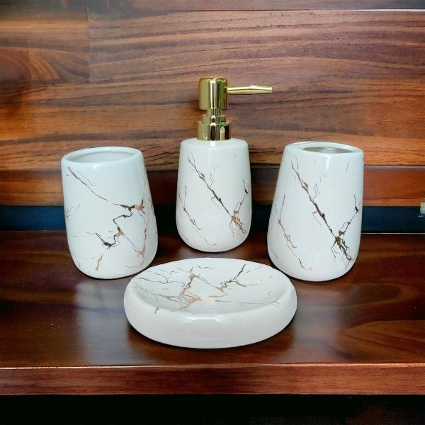 - Material : Ceramic, Pack of 4 items : Toothbrush holder, soap dish, liquid dispenser, tumbler holder; COMPLETE BATH SET: Comes with a Hand Soap Dispenser, Toothbrush Holder, Soap Dish and Tumbler